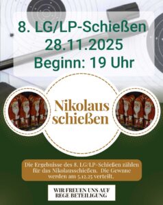 Liebe Schützinnen und Schützen, das 8. LG/LP-Training am Freitag, den 28. November 2025, hat in diesem Jahr eine ganz besondere Bedeutung – denn die an diesem Abend erzielten Ergebnisse fließen direkt in die Wertung für unser Nikolausschießen ein!